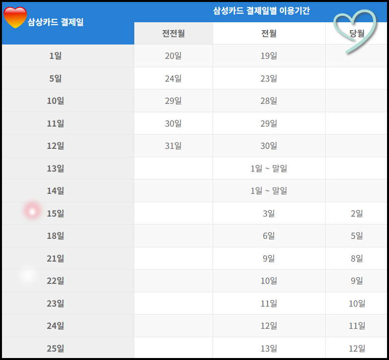 삼성카드 결제일별 이용 기간
